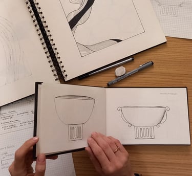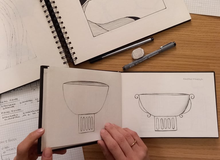 Dietro ogni oggetto c'è sempre lo sviluppo di un'idea, attraverso una progressione di pensieri e azioni quali, schizzi progettuali, studio della forma e delle possibili texture, sperimentazione dei colori e tanto altro.